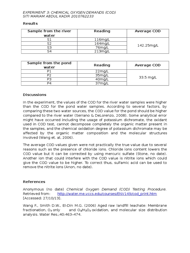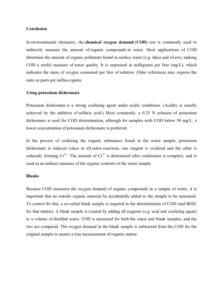 Most types of organic matter are oxidized by a boiling mixture of chromic and sulfuric acids. Review and cite chemical oxygen demand protocol, troubleshooting and other methodology information | contact experts in chemical chemical oxygen demand is indirect measure of total organics present in water. Chemical oxygen demand (cod) is used as a measure of oxygen requirement of a sample that is susceptible to oxidation by strong chemical oxidant. Chemical oxygen demand (cod) refers to the amount of oxygen required to chemically oxidize organic compounds, such as petroleum, solvents, lubricants, cleaning agents, etc., in water. Section group abstract the purpose of this experiment is to demonstrate the principle of chemical oxygen demand (cod) is a common way to measure organics in wastewater.