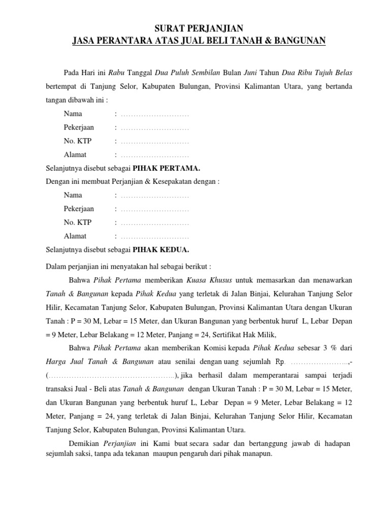 Surat perjanjian jual beli ini biasanya akan ditemukan pada proses jual beli tanah, rumah, mobil, sawah, kebun, sepeda motor, ataupun beberapa harta berharga lainnya. Tujuan dari surat perjanjian jual beli ini adalah agar tidak ada kesalahpahaman di kemudian hari ataupun gugat menggugat. Surat jual beli ini membutuhkan tanda tangan di atas meterai kedua belah pihak. Yang bertanda tangan dibawah ini, saya tanah bangunan tersebut di atas telah menjadi hak milik pihak ke ii. Harga jual beli tanah tersebut dilakukan dan disetujui oleh kedua belah pihak dengan harga tanah sebesar rp 100.000.000,00 (seratus pasal 6 :
