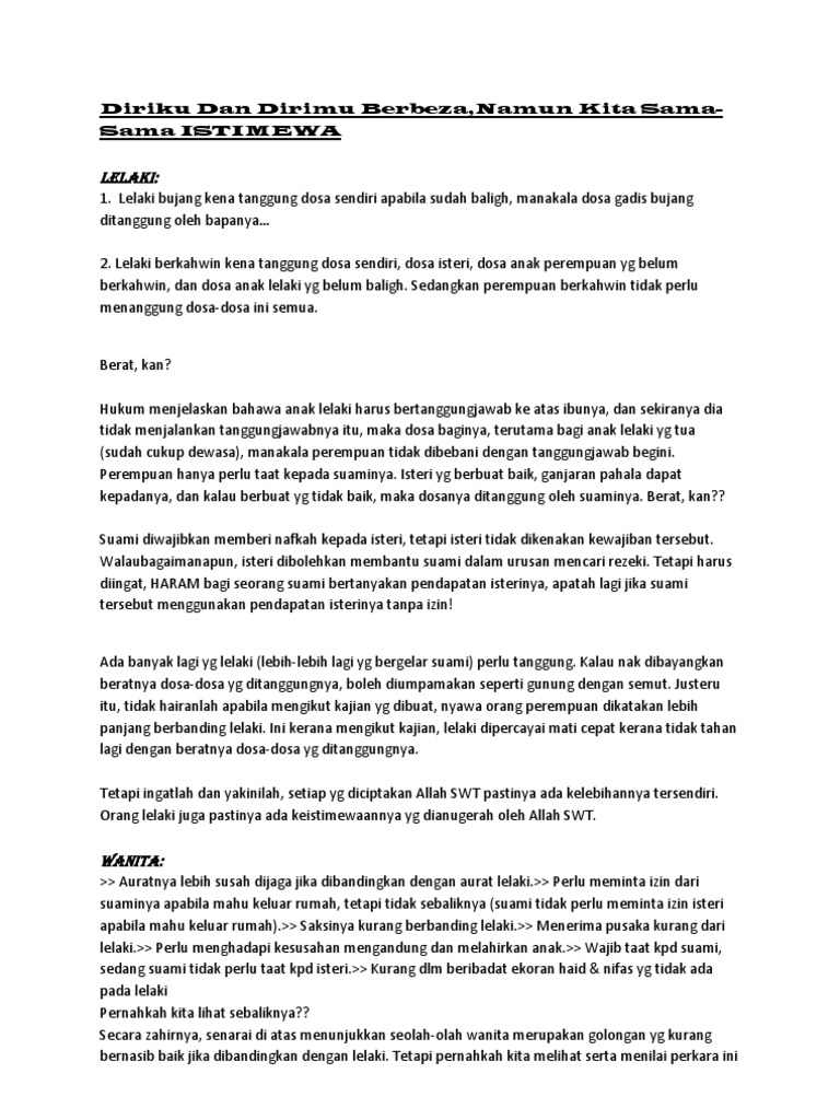 Perempuan boleh mengetahui lelaki itu berbohong dengan membaca gerak isyaratnya. Wanita kurang mampu menahan dingin disebabkan permukaan kulit yang lebih besar 12. Karena itu, seorang lelaki yang soleh tidak lari daripada proses memilih wanita untuk dijadikan pendamping hidupnya. Wanita adalah makhluk yang tersangat unik dan rumit. Nampak remeh tapi impaknya besar bagi.