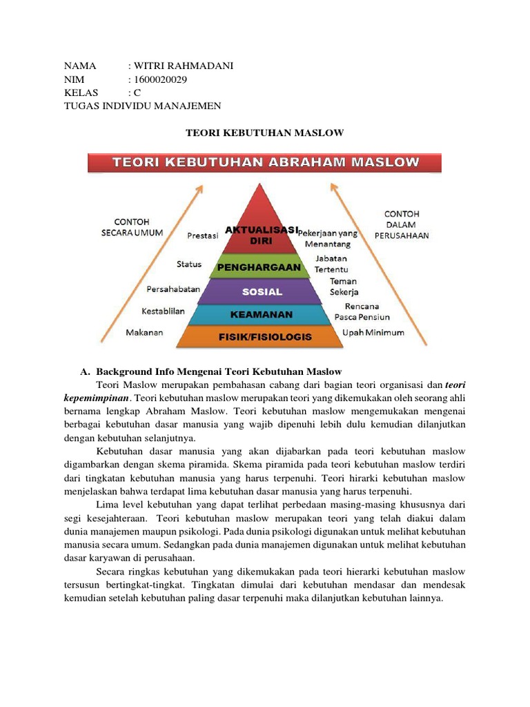 Maslow maslow melih melihat at indiv individu idu sebaga sebagaii sesuat sesuatu u yang yang berint berinter ergra grasi si dan penyus penyusuan uan kesel keseluru uruhan han. Secara mendasar, maslow menjelaskan bahwa motivasi kita dipengaruhi oleh kebutuhan tertentu. Tri lathif ms, s.kom, m.kom kelas : Hierarki kebutuhan individu sudah dikenal luas, namun aplikasinya untuk kepentingan pendidikan. 5 teori hierarki kebutuhan maslow | seorang psikolog humanistik yang bernama abraham maslow mengembangkan teori kepribadian yang mampu memberikan pengaruh terhadap berbagai bidang keilmuan.